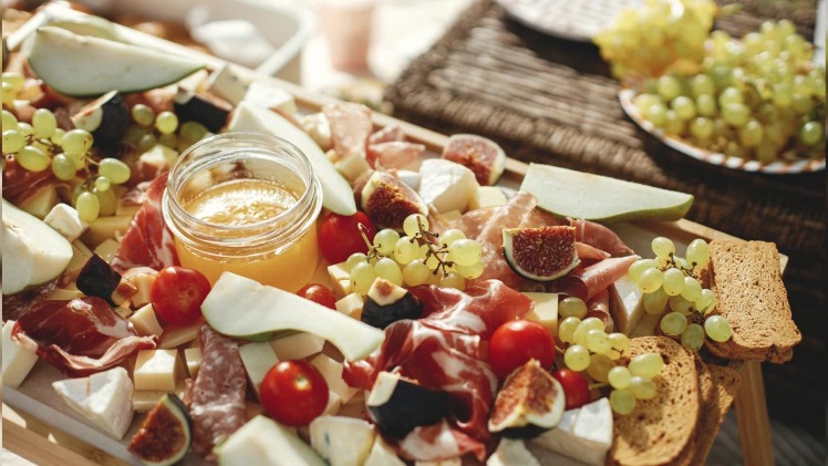 3. Just like Mom, you want some carbs (breads and crackers), meats (deli sliced), salty and savory (like nuts or chips), and briny (pickles and olives). Forget about making “salads. Lay out assorted veggies, guests will create for themselves. A combination of hard and soft cheeses, separated by clusters grapes, will offer a colorful finesse to “our “charcuterie feast”.